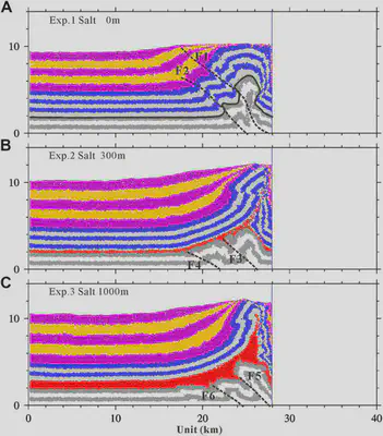 FIGURE 5. Final deformations of three shortening experiments with different salt thicknesses after 12 km of shortening. A) Reference experiment. B) Experiment with thin salt (ca. 300 m). C) Experiment with thick salt (ca. 1,000 m). White and gray denote the subsalt layer. Red denotes the salt layer. Blue and gray denote the prekinematic layer. Violet and yellow denote the synkinematic layer. Bonds of assigned strengths (Table 2) were introduced at all interparticle contacts, except the synkinematic layer (violet and yellow) and salt layer (red). Dashed lines denote faults. The figures of each step are included in the Supplementary Material.