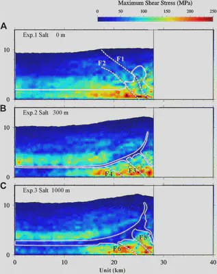 FIGURE 7. Max shear stress illustrated after 12 km of shortening. A) Reference experiment. B) Experiment with thin salt (ca. 300 m). C) Experiment with thick salt (ca. 1,000 m). The final structure of each series is superimposed by plotting regions of high distortional strain (i.e., the absolute value is greater than 4.8 in Figure 6) in black. Dashed lines denote faults. The areas that are trapped by the white solid line denote the salt. The figures of max shear stress for each step are included in the Supplementary Material.