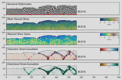 本文研发的离散元后处理程序 DEMpost 可以提取颗粒体系地层边界,勾勒出特定岩层范围,绘制应力应变、速度和位移场等各种云图,是构造变形定量研究不可或缺的工具之一。
