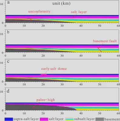 Fig. 3. Numerical simulation experiment model setup: (a) basic model, (b) basement fault model, (c) preexisting salt dome model, and (d) paleo-high model. The initial setting of the progradation model is consistent with the basic model.