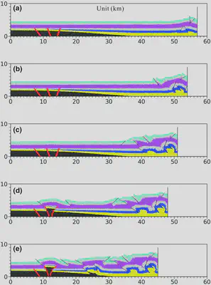 FIGURE 15 Experimental process of Model B. From (a) to (e), the compressive distance is 3, 6, 9, 12 and 15 km respectively. The preexisting faults away from the extrusion edge begin to revive when the extrusion reaches 12 km and finally, form a salt diapir at the top of the basement faults.