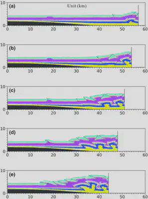 FIGURE 15 Experimental process of Model B. From (a) to (e), the compressive distance is 3, 6, 9, 12 and 15 km respectively. The preexisting faults away from the extrusion edge begin to revive when the extrusion reaches 12 km and finally, form a salt diapir at the top of the basement faults.