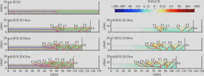 Fig.6 Progressive evolution of model 2 (a) in shortening 14 km(b), 28 km(c), 42 km(d) and the corresponding volumetric strain ((e)-(g))